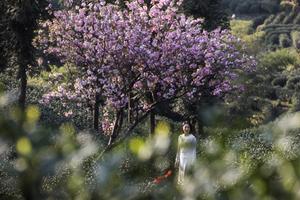 (250406) -- HANGZHOU, 6 abril, 2025 (Xinhua) -- Una turista observa flores de cerezo en un jardín de té, en la aldea de Bashan, en el distrito de Fuyang de la ciudad de Hangzhou, en la provincia de Zhejiang, en el este de China, el 6 de abril de 2025. Los cerezos en las vastas plantaciones de té en las montañas de la aldea de Bashan están en plena floración, lo que atrae a muchos turistas. (Xinhua/Xu Yu) (oa) (da)