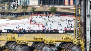 (260109) -- HANGZHOU, 9 enero, 2026 (Xinhua) -- Imagen tomada con un dron el 9 de enero de 2026 de personas divirtiéndose en un carnaval de hielo y nieve, en Hangzhou, en la provincia de Zhejiang, en el este de China. Un carnaval de hielo y nieve comenzó el viernes en el parque siderúrgico del gran canal de Hangzhou, atrayendo a visitantes de toda la ciudad. (Xinhua/Weng Xinyang) (jg) (ra) (vf)
