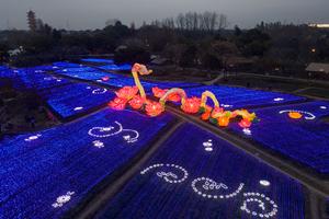 (250124) -- TONGXIANG, 24 enero, 2025 (Xinhua) -- Vista aérea tomada con un dron el 23 de enero de 2025 de una instalación de linternas en forma de serpiente durante una feria de linternas flotantes, en Wuzhen, en la provincia de Zhejiang, en el este de China. La feria de linternas de 21 días de duración comenzó aquí el jueves, presentando linternas coloridas, además de fiestas callejeras, mercados acuáticos y exhibición del patrimonio cultural inmaterial. (Xinhua/Xu Yu) (rtg) (ra) (ce)