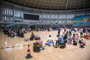 (250730) -- ZHOUSHAN, 30 julio, 2025 (Xinhua) -- Residentes se refugian en un estadio convertido en un sitio de reubicación, en la ciudad de Zhoushan, en la provincia de Zhejiang, en el este de China, el 30 de julio de 2025. Co-may, el octavo tifón de este año, tocó tierra en la provincia oriental china de Zhejiang alrededor de las 4:30 horas del miércoles, informó el observatorio meteorológico provincial. Co-May, cuya fuerza máxima del viento cerca de su centro alcanza los 23 metros por segundo, tocó tierra en la ciudad de Zhoushan. (Xinhua/Jiang Han) (jg) (da) (vf)