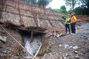(250730) -- ZHOUSHAN, 30 julio, 2025 (Xinhua) -- Empleados patrullan un área con alto riesgo de desastres geológicos, en la ciudad de Zhoushan, en la provincia de Zhejiang, en el este de China, el 30 de julio de 2025. Co-may, el octavo tifón de este año, tocó tierra en la provincia oriental china de Zhejiang alrededor de las 4:30 horas del miércoles, informó el observatorio meteorológico provincial. Co-May, cuya fuerza máxima del viento cerca de su centro alcanza los 23 metros por segundo, tocó tierra en la ciudad de Zhoushan. (Xinhua/Jiang Han) (jg) (da) (vf)