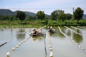 (250810) -- ZHUJI, 10 agosto, 2025 (Xinhua) -- Imagen del 9 de agosto de 2025 de trabajadores liberando mejillones en una base de cultivo inteligente de perlas, en el poblado de Shanxiahu de la ciudad de Zhuji, en la provincia de Zhejiang, en el este de China. El poblado de Shanxiahu de la provincia de Zhejiang es famoso por su industria de perlas que abarca desde el cultivo, el procesamiento y el comercio de perlas hasta el turismo cultural. Shanxiahu ha adoptado innovaciones tecnológicas en los últimos años para impulsar el cultivo ecológico de perlas y el desarrollo sostenible. Este poblado es ahora un importante centro comercial de perlas y una plataforma de comercio de joyas en línea en China, que gestiona el 80 por ciento del volumen comercial de perlas del país, y el negocio de la "economía de la belleza" también ha mejorado considerablemente los ingresos de los hogares de la zona. (Xinhua/Mao Zhu) (oa) (da)