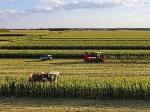 (241004) -- BEIJING, Oct. 4, 2024 (Xinhua) -- An aerial drone photo shows harvesters working in corn fields in Yanjia Village of Guangrao County, east China's Shandong Province, Oct. 1, 2024. (Photo by Liu Yunjie/Xinhua)