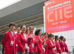(251105) -- SHANGHAI, 5 noviembre, 2025 (Xinhua) -- Voluntarios son vistos en la VIII Exposición Internacional de Importaciones de China (CIIE, por sus siglas en inglés), en Shanghai, en el este de China, el 5 de noviembre de 2025. Con la mayor área de exhibición en su historia y un número récord de expositores, la VIII CIIE, bajo el tema "Nueva Era, Futuro Compartido", ha atraído a 4.108 expositores extranjeros de 155 países, regiones y organizaciones internacionales, con una superficie total de exhibición que supera los 430.000 metros cuadrados. (Xinhua/Liu Ying) (jg) (da) (ce)