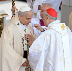 (250519) -- CIUDAD DEL VATICANO, 19 mayo, 2025 (Xinhua) -- Imagen del 18 de mayo de 2025 del papa León XIV (i), recibiendo el palio, o estola de lana de cordero, símbolo del papado, durante la misa de investidura, en la Plaza de San Pedro, en la Ciudad del Vaticano. León XIV fue investido oficialmente como pontífice de la Iglesia Católica Romana el domingo. (Xinhua/Alberto Lingria) (rtg) (ah) (ce)