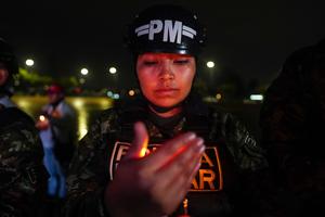 (260326) -- BOGOTA, 26 marzo, 2026 (Xinhua) -- Imagen del 25 de marzo de 2026 de una elemento de las Fuerzas Militares participando en un velatón en homenaje a las víctimas del accidente de un avión Hércules del Ejército Nacional de Colombia ocurrido el lunes en el departamento de Putumayo, frente al Monumento de los Héroes, en Bogotá, capital de Colombia. (Xinhua/Andrés Moreno) (am) (rtg) (ra) (vf)