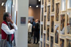 (250925) -- BOGOTA, 25 septiembre, 2025 (Xinhua) -- Imagen del 24 de septiembre de 2025 de un hombre observando una obra de arte en la Feria Internacional de Arte de Bogotá ARTBO, en Bogotá, capital de Colombia. La Feria Internacional de Arte de Bogotá ARTBO, una de las más importantes de la región latinoamericana, abre sus puertas del 25 al 28 de septiembre en el espacio ferial Agora de la capital colombiana. (Xinhua/Andrés Moreno) (am) (jg) (ah) (ce)