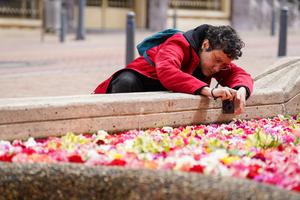 (250920) -- BOGOTA, 20 septiembre, 2025 (Xinhua) -- Una mujer toma una fotografía de la instalación floral "El Canto del Río" en el marco de la Bienal Internacional de Arte y Ciudad BOG25, en Bogotá, capital de Colombia, el 20 de septiembre de 2025. (Xinhua/Andrés Moreno) (am) (oa) (ra) (ce)