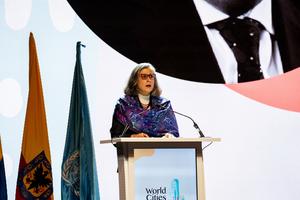 (251101) -- BOGOTA, 1 noviembre, 2025 (Xinhua) -- Imagen del 31 de octubre de 2025 de la directora ejecutiva de ONU-Hábitat, Anacláudia Rossbach, hablando en un evento para conmemorar la celebración global del Día Mundial de las Ciudades, en Bogotá, Colombia. La celebración global del Día Mundial de las Ciudades 2025 se llevó a cabo aquí el viernes en la capital colombiana con el tema "Ciudades inteligentes centradas en las personas". En el marco de la celebración se llevó a cabo la entrega del Premio Global para el Desarrollo Sostenible en Ciudades, también conocido como Premio Shanghai. (Xinhua/Xu Yongzheng) (jg) (da)