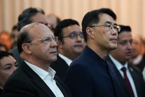 (250925) -- BOGOTA, 25 septiembre, 2025 (Xinhua) -- Imagen del 24 de septiembre de 2025 del ministro de Hacienda colombiano, Germán Avila Plazas (i-frente) y el embajador de China en Colombia, Zhu Jingyang (d-frente), asistiendo a una recepción por el 76° aniversario de la fundación de la República Popular China, celebrada en la residencia del embajador de China en Colombia, en Bogotá, capital de Colombia. Destacadas personalidades de la política colombiana, empresarios y miembros de la comunidad china en Colombia celebraron la noche del miércoles el 76º aniversario de la fundación de la República Popular China en una recepción organizada por la Embajada de China en este país sudamericano. (Xinhua/Andrés Moreno) (am) (rtg) (ra) (vf)