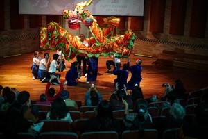 (250125) -- BOGOTÁ, 25 enero, 2025 (Xinhua) -- Personas observan una presentación de la danza del dragón durante un evento cultural para celebrar el Año Nuevo Lunar chino o Fiesta de la Primavera, en Bogotá, Colombia, el 25 de enero 2025. Con una serie de presentaciones culturales y muestras artísticas avanzan las celebraciones del Año Nuevo Lunar chino que realiza cada año la Red de Bibliotecas Públicas de Bogotá y que en esta ocasión recibe la llegada de la Serpiente de Madera, de acuerdo con el horóscopo lunar del país asiático. (Xinhua/Andrés Moreno) (am) (jg) (da)
