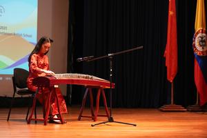 (250429) -- BOGOTA, 29 abril, 2025 (Xinhua) -- Imagen del 28 de abril de 2025 de una concursante realizando su muestra de talento durante el acto de inauguración de la 24ª edición del concurso mundial Puente Chino en el Aula Máxima de la Universidad Jorge Tadeo Lozano, en la ciudad de Bogotá, capital de Colombia. El Aula Máxima de la Universidad Jorge Tadeo Lozano en Bogotá fue la sede del inicio de la 24ª edición del concurso mundial Puente Chino, con el que los institutos Confucio y los colegios que imparten clases de idioma chino mandarín promueven el aprendizaje de esta lengua al tiempo que incentivan a sus estudiantes a sumergirse en la cultura milenaria del país asiático. (Xinhua/Andrés Moreno) (am) (ah) (ra) (vf)