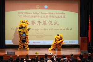 (250429) -- BOGOTA, 29 abril, 2025 (Xinhua) -- Imagen del 28 de abril de 2025 de artistas realizando la danza del león durante el acto de inauguración de la 24ª edición del concurso mundial Puente Chino en el Aula Máxima de la Universidad Jorge Tadeo Lozano, en la ciudad de Bogotá, capital de Colombia. El Aula Máxima de la Universidad Jorge Tadeo Lozano en Bogotá fue la sede del inicio de la 24ª edición del concurso mundial Puente Chino, con el que los institutos Confucio y los colegios que imparten clases de idioma chino mandarín promueven el aprendizaje de esta lengua al tiempo que incentivan a sus estudiantes a sumergirse en la cultura milenaria del país asiático. (Xinhua/Andrés Moreno) (am) (ah) (ra) (vf)