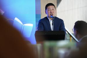 (250617) -- BOGOTÁ, 17 junio, 2025 (Xinhua) -- Imagen del 16 de junio de 2025 del gerente ejecutivo del consorcio Metro Línea 1, Ding Wen, hablando durante un acto de donación de libros a la Universidad de los Andes, en la ciudad de Bogotá, capital de Colombia. Con la implementación de un programa cultural denominado "That's China Bookshelf" ("Esa es la estantería china de libros"), el consorcio Metro Línea 1, que construye ese tramo del metro de Bogotá, donó el lunes un lote de más de 300 libros a la Universidad de Los Andes, radicada en la capital de Colombia. (Xinhua/Andrés Moreno) (am) (jg) (ra) (vf)