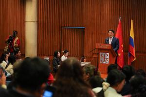 (250926) -- BOGOTA, 26 septiembre, 2025 (Xinhua) -- Imagen del 25 de septiembre de 2025 del embajador de China en Colombia, Zhu Jingyang, hablando durante el evento "El té une al mundo", llevado a cabo en el Centro Cultural Gabriel García Márquez, en Bogotá, capital de Colombia. Entre aromas y sabores que recorren continentes, el Centro Cultural Gabriel García Márquez de Bogotá fue escenario el jueves del evento "El té une al mundo", un encuentro que fusionó la milenaria tradición del té chino con la rica cultura del café colombiano, en un diálogo cultural que busca acercar corazones y mercados entre China y Colombia. (Xinhua/Andrés Moreno) (am) (jg) (rtg) (vf)