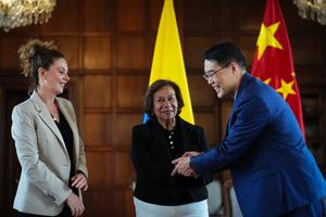 (250806) -- BOGOTA, 6 agosto, 2025 (Xinhua) -- Imagen del 5 de agosto de 2025 del embajador de la República Popular China en Colombia, Zhu Jingyang (d), la canciller encargada de Colombia, Yolanda Villavicencio (c), y la directora general de la Agencia Presidencial de Cooperación Internacional de Colombia, Eleonora Betancur (i), reaccionando luego de la firma de un convenio de cooperación económica y técnica entre los Gobiernos de Colombia y China, en el Palacio de San Carlos, sede del Ministerio de Relaciones Exteriores, en Bogotá, Colombia. Los Gobiernos de Colombia y China firmaron el martes un convenio de cooperación económica y técnica con miras a fortalecer temas de infraestructura y desarrollo social de territorios vulnerables en el país sudamericano. (Xinhua/Andrés Moreno) (am) (jg) (da) (ce)