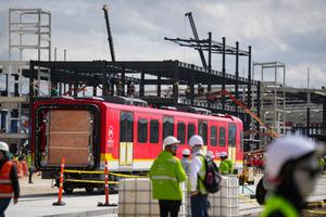 (250911) -- BOGOTA, 11 septiembre, 2025 (Xinhua) -- Trabajadores observan uno de los vagones durante la llegada del primer tren de la Línea 1 del Metro de Bogotá al patio-taller, en el sur de Bogotá, capital de Colombia, el 11 de septiembre de 2025. Durante la madrugada del jueves llegó a Bogotá el primer tren de la Línea 1 del Metro de la capital colombiana, cuya construcción está a cargo del consorcio conformado por las empresas chinas China Harbour Engineering Company Limited y Xi'an Metro Company Limited, obra que tiene un avance del 62,16 por ciento, de acuerdo con información de la alcaldía. (Xinhua/Andrés Moreno) (am) (rtg) (ra) (ce)