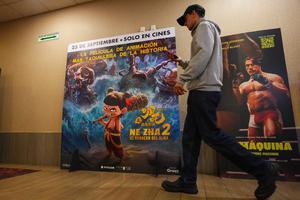 (250927) -- BOGOTA, 27 septiembre, 2025 (Xinhua) -- Imagen del 26 de septiembre de 2025 de un hombre caminando frente a un cartel de la película de animación china "Ne Zha 2" en un cine, en Bogotá, capital de Colombia. Con su arribo a Latinoamérica el 25 de septiembre, los colombianos disfrutan de la exhibición de "Ne Zha 2", la película animada más taquillera de la historia y que ha recaudado de más de 2.000 millones de dólares desde su estreno en China el 29 de enero de 2025. (Xinhua/Andrés Moreno) (am) (oa) (ra) (vf)