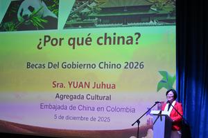 (251206) -- BOGOTA, 6 diciembre, 2025 (Xinhua) -- Imagen del 5 de diciembre de 2025 de la agregada cultural de la Embajada de China en Colombia, Yuan Juhua, hablando en el evento de presentación del programa de becas de posgrado en China dirigidas a estudiantes colombianos en la Universidad ECCI, en Bogotá, capital de Colombia. La Embajada de la República Popular China en Colombia y el Instituto Colombiano de Crédito Educativo y Estudios Técnicos en el Exterior resaltaron las oportunidades que brinda el programa de becas de posgrado en el país asiático del Consejo de Becas de China. (Xinhua/Andrés Moreno) (am) (jg) (da)