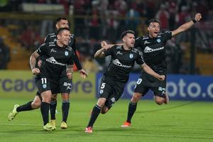 (250226) -- BOGOTA, 26 febrero, 2025 (Xinhua) -- (De izq. a der.) Imagen del 25 de febrero de 2025 de los jugadores Alvaro Ramos, Diego Orellana, César Fuentes, y Matías Blázquez, de Deportes Iquique de Chile, festejando la victoria al término del partido de vuelta de la fase 2 de la Copa Conmebol Libertadores ante Independiente Santa Fe de Colombia, celebrado en el Estadio Metropolitano de Techo, en Bogotá, Colombia. (Xinhua/Andrés Moreno) (am) (ah) (ra) (vf)