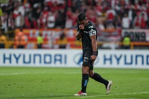 (250226) -- BOGOTA, 26 febrero, 2025 (Xinhua) -- Imagen del 25 de febrero de 2025 del jugador Hans Salinas, de Deportes Iquique de Chile, festejando su anotación durante la tanda de penales del partido de vuelta de la fase 2 de la Copa Conmebol Libertadores ante Independiente Santa Fe de Colombia, celebrado en el Estadio Metropolitano de Techo, en Bogotá, Colombia. (Xinhua/Andrés Moreno) (am) (ah) (ra) (vf)