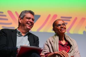 (250821) -- BOGOTA, 21 agosto, 2025 (Xinhua) -- El jefe de la Secretaría General de la Presidencia de la República de Brasil, Márcio Costa Macedo (i), reacciona junto a la ministra de Medio Ambiente brasileña, Marina Silva (d), durante el evento "Amazonía rumbo a la COP30 de Cambio Climático" llevado a cabo en el marco de la Cumbre de los Países Amazónicos, en el Centro de Memoria, Paz y Reconciliación, en Bogotá, capital de Colombia, el 21 de agosto de 2025. (Xinhua/Andrés Moreno) (am) (jg) (ah) (ce)