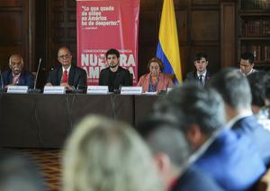 (260124) -- BOGOTA, 24 enero 2026 (Xinhua) -- (De izq. a der.) El embajador de Venezuela en Colombia, Carlos Eduardo Martínez Mendoza, el embajador de Cuba en Colombia, Carlos de Céspedes, el director de la Academia Diplomática del Ministerio de Relaciones Exteriores colombiano, Harol González Duque, la canciller colombiana, Yolanda Villavicencio, el co-coordinador general de la Internacional Progresista, David Adler, y el secretario de Finanzas de Honduras, Christian Duarte, participan durante la apertura de la cumbre de emergencia "Nuestra América", en Bogotá, capital de Colombia, el 24 de enero de 2026. El Palacio de San Carlos, sede de la cancillería de Colombia, es el punto de encuentro de más de 100 líderes globales en la cumbre de emergencia "Nuestra América", que busca discutir y articular un plan de defensa de la soberanía de la región de América Latina. (Xinhua/Andrés Moreno) (am) (oa) (da)