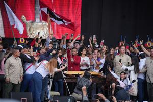 (250501) -- BOGOTA, 1 mayo, 2025 (Xinhua) -- El presidente colombiano, Gustavo Petro (c), sostiene la espada del Libertador, Simón Bolívar, durante una marcha por el Día Internacional de los Trabajadores, en la Plaza de Bolívar, en la ciudad de Bogotá, capital de Colombia, el 1 de mayo de 2025. (Xinhua/Andrés Moreno) (am) (jg) (ah) (ce)
