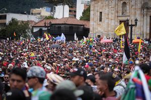(250501) -- BOGOTA, 1 mayo, 2025 (Xinhua) -- Personas participan durante una marcha por el Día Internacional de los Trabajadores, en la Plaza de Bolívar, en la ciudad de Bogotá, capital de Colombia, el 1 de mayo de 2025. (Xinhua/Andrés Moreno) (am) (jg) (ah) (ce)
