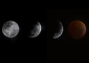 (250314) -- BOGOTA, 14 marzo, 2025 (Xinhua) -- Imagen combinada iniciada el 13 de marzo de 2025 y finalizada el 14 de marzo de 2025 de las fases de la luna durante un eclipse lunar total, en Bogotá, Colombia. (Xinhua/Andrés Moreno) (am) (jg) (da) (vf)