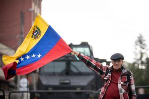 (260116) -- BOGOTA, 16 enero, 2026 (Xinhua) -- Imagen del 15 de enero de 2026 de un hombre sosteniendo una bandera de Venezuela mientras participa en una manifestación frente a la Embajada de Estados Unidos, en Bogotá, capital de Colombia. Al menos un centenar de ciudadanos colombianos se manifestaron el jueves frente a la Embajada de Estados Unidos en Bogotá, la capital colombiana, para rechazar la injerencia de ese país en Latinoamérica, especialmente las acciones militares del pasado 3 de enero en Caracas y la captura del presidente venezolano, Nicolás Maduro. (Xinhua/Andrés Moreno) (am) (oa) (ra) (vf)
