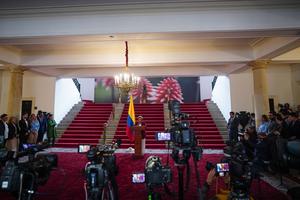 (260108) -- BOGOTA, 8 enero, 2026 (Xinhua) -- La ministra de Relaciones Exteriores colombiana, Yolanda Villavicencio (c-atrás), asiste a una conferencia de prensa en la sede de la Cancillería de Colombia, en Bogotá, capital de Colombia, el 8 de enero de 2026. Como un punto de partida para el restablecimiento completo de las relaciones entre Colombia y Estados Unidos calificó el jueves la canciller colombiana, Rosa Yolanda Villavicencio, la conversación telefónica sostenida el miércoles por los presidentes Gustavo Petro y Donald Trump. (Xinhua/Andrés Moreno) (am) (ah) (vf)