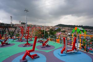 (260130) -- BOGOTA, 30 enero, 2026 (Xinhua) -- Imagen del 29 de enero de 2026 de una vista de la ciudad frente a una estructura de un teleférico en construcción que será propulsado por energía solar en un barrio, en el sur de la ciudad de Bogotá, capital de Colombia. La implementación de energías limpias en el mobiliario público y de estrategias de movilidad social centradas en el desarrollo de las personas han sido claves para que Bogotá sea hoy un modelo internacional de políticas públicas en el desarrollo urbano, señaló a Xinhua Vanessa Velasco, directora de la Secretaría Distrital de Hábitat de la Administración de la capital colombiana. (Xinhua/Andrés Moreno) (am) (rtg) (ra) (vf)