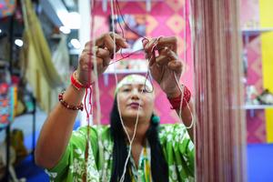 (251206) -- BOGOTA, 6 diciembre, 2025 (Xinhua) -- Imagen del 5 de diciembre de 2025 de una mujer tejiendo durante el primer día de la Feria Internacional Expoartesanías en el recinto ferial Corferias, en Bogotá, capital de Colombia. Con un énfasis en el impulso de los artesanos pertenecientes a los territorios afectados por el conflicto armado y otras problemáticas sociales de Colombia, dio inicio el fin de semana la Feria Internacional Expoartesanías en Bogotá. (Xinhua/Andrés Moreno) (am) (oa) (da)
