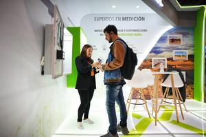 (251017) -- BOGOTA, 17 octubre, 2025 (Xinhua) -- Una mujer ofrece información a un visitante durante la novena versión de ExpoSolar Colombia 2025, en el recinto ferial de Corferias, en Bogotá, capital de Colombia, el 17 de octubre de 2025. (Xinhua/Andrés Moreno) (am) (oa) (ra) (ce)