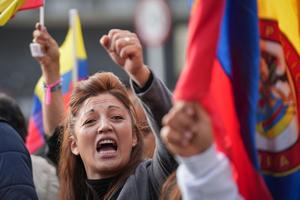 (250210) -- BOGOTA, 10 febrero, 2025 (Xinhua) -- Una simpatizante del expresidente colombiano, Alvaro Uribe participa en una protesta frente al Complejo Judicial de Paloquemao, en donde se lleva a cabo el juicio contra Uribe, en Bogotá, Colombia, el 10 de febrero de 2025. (Xinhua/Andrés Moreno) (am) (rtg) (ah)