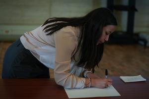 (250427) -- BOGOTA, 27 abril, 2025 (Xinhua) -- Imagen del 26 de abril de 2025 de una participante demostrando su dominio de la caligrafía china durante un concurso realizado en el marco del Festival de la Lengua China celebrado en la Biblioteca Pública Virgilio Barco, en Bogotá, capital de Colombia. El evento, gratuito y abierto a todas las edades, se basó en la presentación de las capacidades lingüísticas de los estudiantes de la Casa Colombo China, una organización que imparte clases tanto del idioma como de artes marciales y además brinda asesorías en temas de comercio entre ambos países. (Xinhua/Andrés Moreno) (am) (rtg) (da)