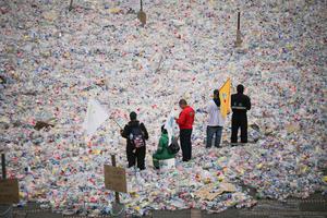 (250624) -- BOGOTA, 24 junio, 2025 (Xinhua) -- Imagen proveída por COLPRENSA de recicladores participando en una manifestación en la que cubrieron con botellas reciclables la Plaza de Bolívar, en la ciudad de Bogotá, capital de Colombia, el 24 de junio de 2025. (Xinhua/Cristian Bayona/Colprensa) (oa) (ra) (vf)