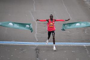 (250728) -- BOGOTA, 28 julio, 2025 (Xinhua) -- Imagen del 27 de julio de 2025 del atleta keniano, Philemon Kiplimo, cruzando la meta del Medio Maratón de Bogotá, en Bogotá, capital de Colombia. La edición anual del Medio Maratón de Bogotá cumplió el domingo 25 años como la principal carrera atlética llevada a cabo en calles y avenidas de la capital de Colombia, según difundieron los organizadores. (Xinhua/Andrés Moreno) (am) (oa) (ah)