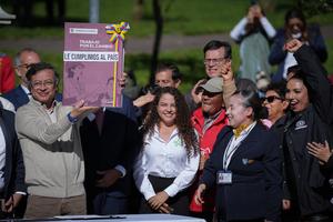 (250626) -- BOGOTA, 26 junio, 2025 (Xinhua) -- Imagen del 25 de junio de 2025 del presidente colombiano, Gustavo Petro (i), levantando un cartel durante un evento para firmar la ley que sanciona la reforma laboral, en la ciudad de Bogotá, capital de Colombia. Petro firmó el miércoles, ante una multitud reunida a las afueras de la Casa Museo Quinta de Bolívar de Bogotá, la ley que sanciona la reforma laboral orientada a ampliar y proteger los derechos de los trabajadores del país andino. (Xinhua/Andrés Moreno) (am) (rtg) (ra) (vf)