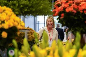 (251002) -- BOGOTA, 2 octubre, 2025 (Xinhua) -- Una mujer sonríe mientras observa especies de flores durante la feria internacional Proflora 2025, llevada a cabo en el recinto ferial Corferias, en Bogotá, capital de Colombia, el 2 de octubre de 2025. (Xinhua/Andrés Moreno) (am) (jg) (ah) (vf)