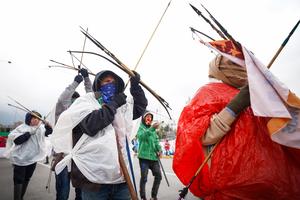 (251017) -- BOGOTA, 17 octubre, 2025 (Xinhua) -- Personas sostienen arcos y flechas mientras participan en una protesta frente a la Embajada de Estados Unidos, en Bogotá, capital de Colombia, el 17 de octubre de 2025. (Xinhua/Andrés Moreno) (am) (oa) (ra) (ce)