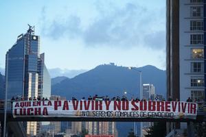 (251008) — BOGOTA, 8 octubre, 2025 (Xinhua) — Imagen del 7 de octubre de 2025 de personas participando en una protesta en apoyo a Palestina, en Bogotá, capital de Colombia. (Xinhua/Andrés Moreno) (am) (ah) (ra) (ce)