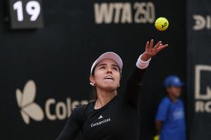(250404) -- BOGOTA, 4 abril, 2025 (Xinhua) -- Camila Osorio sirve la pelota durante el partido de cuartos de final de sencillos entre Tatjana Maria, de Alemania, y Camila Osorio, de Colombia, en el torneo de tenis Copa Colsanitas Zurich 2025 de la WTA, en la ciudad de Bogotá, capital de Colombia, el 4 de abril de 2025. (Xinhua/Andrés Moreno) (am) (oa) (da) (vf)