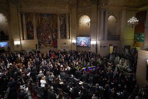 (250812) -- BOGOTA, 12 agosto, 2025 (Xinhua) -- Imagen del 11 de agosto de 2025 de personas participando durante la cámara ardiente del fallecido senador y precandidato presidencial colombiano, Miguel Uribe Turbay, llevada a cabo en el Salón Elíptico del Congreso de la República, en la ciudad de Bogotá, capital de Colombia. El senador y precandidato presidencial colombiano, Miguel Uribe Turbay, murió el lunes a las 1:56 de la mañana, informó la Clínica Fundación Santa Fe, en donde permanecía desde el pasado 7 de junio cuando fue víctima de un atentado en Bogotá. (Xinhua/Andrés Moreno) (am) (jg) (ra) (ce)