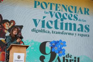 (250409) -- BOGOTA, 9 abril, 2025 (Xinhua) -- La subdirectora general de la Unidad para la Atención y Reparación Integral a las Víctimas, Lyda Camacho, habla durante un acto conmemorativo por las víctimas del conflicto armado en Colombia, en la ciudad de Bogotá, Colombia, el 9 de abril de 2025. Colombia conmemora el miércoles el Día Nacional por la Memoria y la Solidaridad con las Víctimas del Conflicto Armado, con la realización de actos culturales y espacios de visibilización para los miles de personas afectadas por la guerra y con un llamado a la empatía y a luchar contra el olvido. (Xinhua/Andrés Moreno) (am) (jg) (da) (ce)
