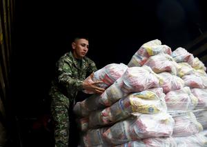(250124) -- BOGOTA, 24 enero, 2025 (Xinhua) -- Imagen proveída por COLPRENSA del 24 de enero de 2025 de un elemento del Ejército Nacional de Colombia acomodando paquetes de ayuda que serán enviados a refugios en Tibú y Cúcuta para personas que han sido desplazadas de sus territorios debido a la violencia, en Bogotá, Colombia. La crisis humanitaria y violencia que se vive en la región colombiana de Catatumbo (noreste), la cual ha dejado decenas de muertos y miles de desplazados y campesinos confinados, se está extendiendo a otras regiones del país como Guaviare (sur), alertó el jueves la fiscal colombiana, Luz Adriana Camargo. (Xinhua/Lina Gasca/COLPRENSA) (cl) (rtg) (ra) (vf)