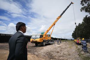 (250618) — FACATATIVA, 18 junio, 2025 (Xinhua) — Imagen del 17 de junio de 2025 de un hombre observando a trabajadores levantar un tramo de la antigua vía férrea en un acto simbólico durante la ceremonia de inicio de obras del proyecto del tren de cercanías Regiotram de Occidente, en el municipio de Facatativá, en el departamento de Cundinamarca, Colombia. Con el levantamiento simbólico de un tramo de la antigua vía férrea que recorre la sabana de Bogotá, el martes comenzaron oficialmente las obras de un nuevo corredor para el tren de cercanías de la capital colombiana, cuyo concesionario es la compañía China Civil Engineering Construction Corporation (CCECC).(Xinhua/Andrés Moreno) (am) (jg) (da)