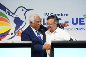 (251109) -- SANTA MARTA, 9 noviembre, 2025 (Xinhua) -- El presidente colombiano, Gustavo Petro (d), se abraza con el presidente del Consejo Europeo, Antonio Costa (i), durante una declaración conjunta al término del primer día de la IV Cumbre de la Comunidad de Estados Latinoamericanos y Caribeños-Unión Europea (CELAC-UE), en Santa Marta, Colombia, el 9 de noviembre de 2025. (Xinhua/Andrés Moreno) (am) (oa) (ah)