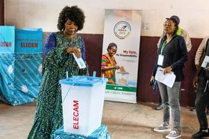 (251012) -- YAOUNDE, Oct. 12, 2025 (Xinhua) -- A voter casts her ballot at a polling station during the presidential election in Yaounde, Cameroon, Oct. 12, 2025. Voting for Cameroon's presidential election started early on Sunday as voters queued up outside polling stations across the country.